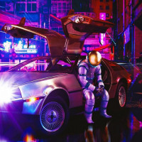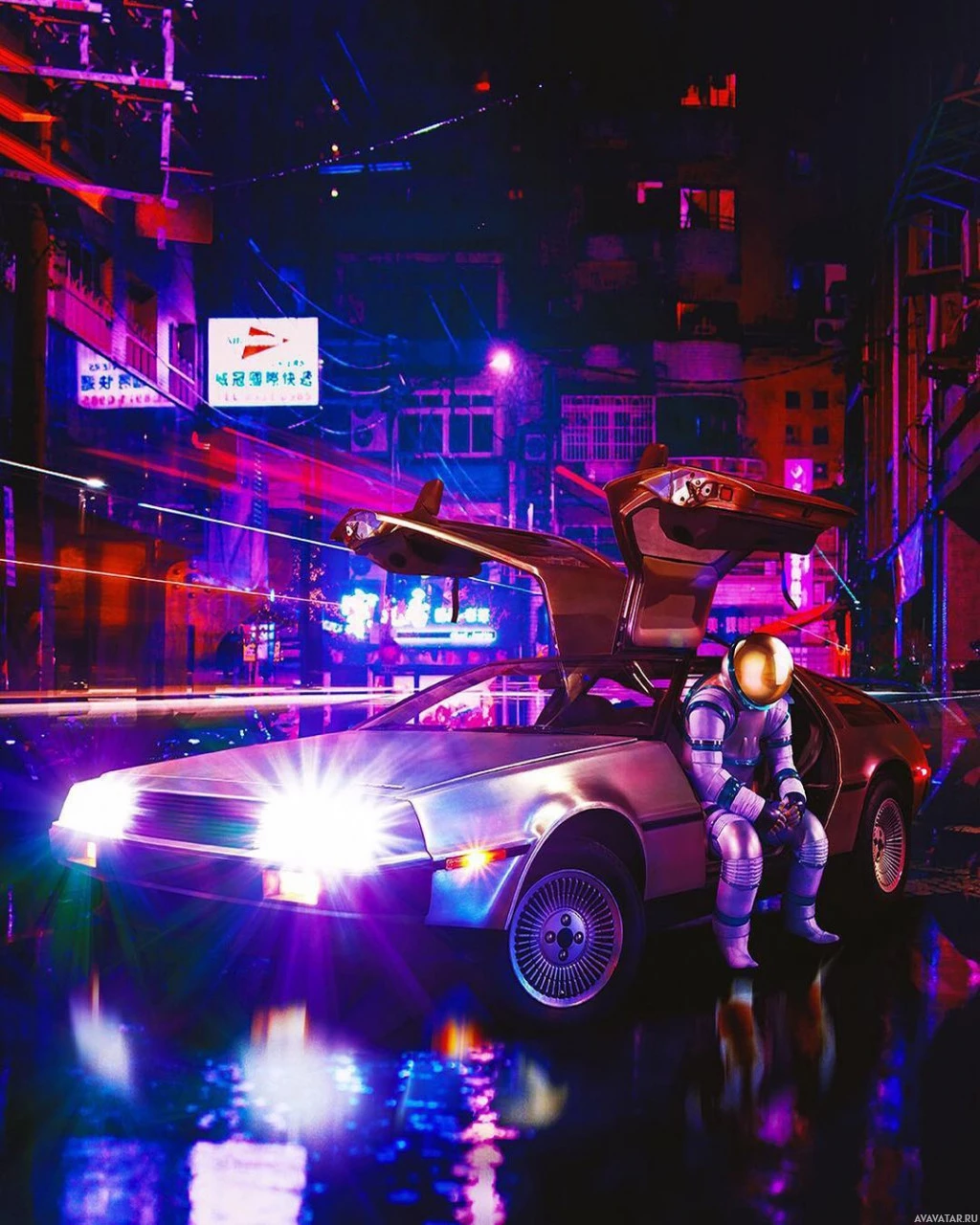 a futuristic scene featuring an astronaut standing in the rain next to a car. The car has distinctive "Back to the Future" designs, including a glowing flux capacitor and a red lightning bolt graphic on the hood, which are iconic elements from