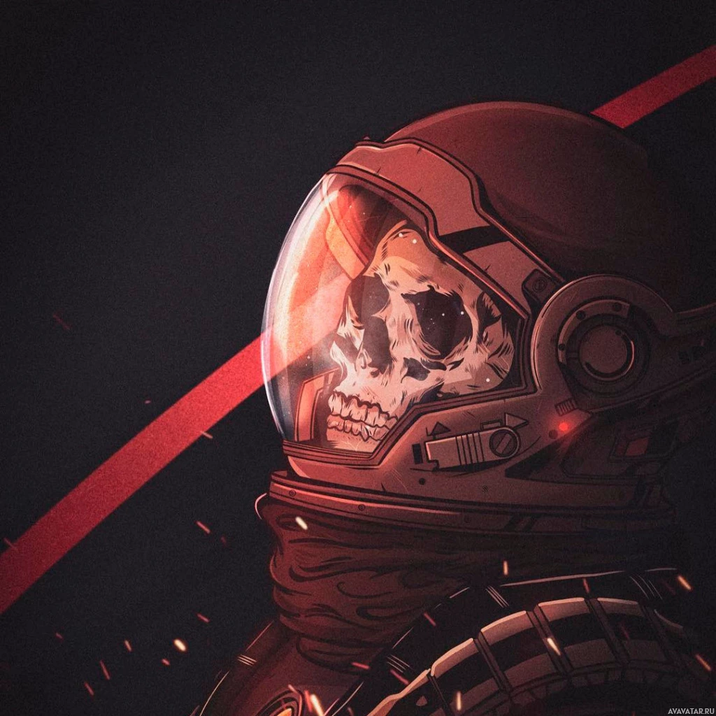 a full spacesuit, complete with a helmet that has a skull visor. The background suggests movement or action, possibly indicating that the astronaut is in flight or engaged in some