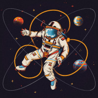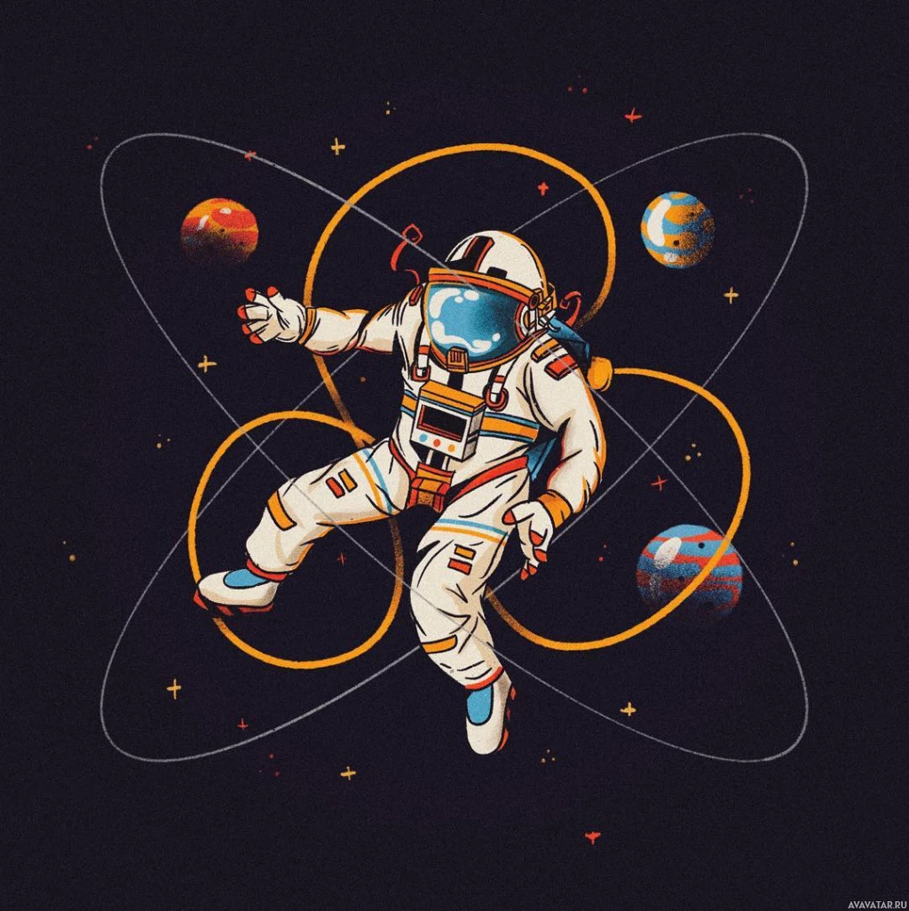 The image features an illustration of an astronaut floating in space. The astronaut is wearing a spacesuit, and the suit has