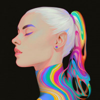 blonde hair and appears to be in a thoughtful or contemplative pose. Her skin tone is light, and she has subtle features that suggest she might be of Caucasian descent. The artwork has a modern and colorful aesthetic, with the colors appearing vibrant around her face, possibly representing an inner glow or expression of creativity and
