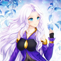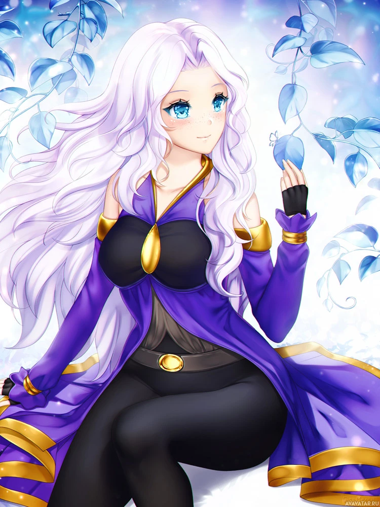 blonde hair and purple eyes. She has