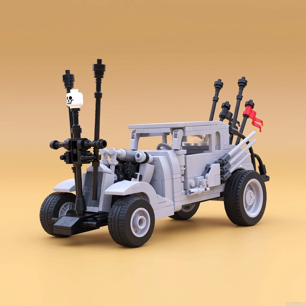 Lego creation includes features such as a large exhaust pipe, a gun rack on top, and various other details that are characteristic of the original vehicle. The design suggests it has been built for display or play purposes, showcasing the creativity and attention to detail in building and customizing