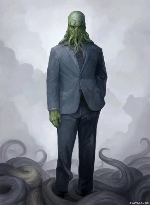 a body of water or smoke, wearing formal attire, which contrasts with the monstrous nature typically ascribed to Cthulhu in Lovecraft's stories. This image seems to blend elements of fantasy with the classic horror of Lovecraftian mythos, creating a unique and imaginative depiction of this