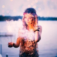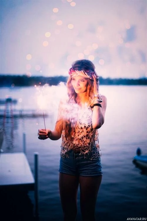 a young woman standing by the water at dusk or night. She is holding a sparkler in her hand and appears to be blowing it out, with embers glowing brightly around it. The light reflects on the surface of the water behind her, creating