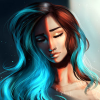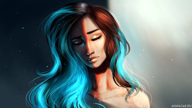 На картинке изображена стилизованная иллюстрация молодой женщины с закрытыми глазами. У нее длинные синие волосы, и ее выражение - созерцание или мечта. Фон предполагает внутреннюю обстановку с теплым, мягким освещением.