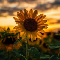 the warm colors in the sky. The sunflowers are in full bloom with their large, round heads facing towards the camera, which is typical for these plants as they follow