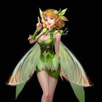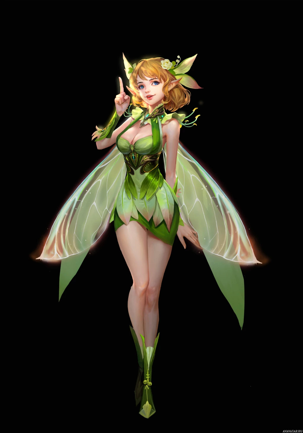 golden hair and is adorned in a costume with green accents, which includes wings that resemble those of a dragonfly or fairy. Her attire consists of a dress with a skirt that mimics the pattern of leaves or petals, complemented by