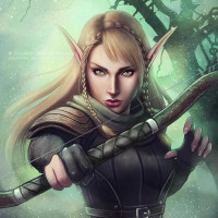 fantasy character, often referred to as an elf. She is holding a bow and appears to be aiming at something or someone in the distance. She has pointed ears characteristic of many fantasy elves, and her attire suggests she might be a ranger or an archer skilled in combat within this