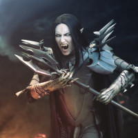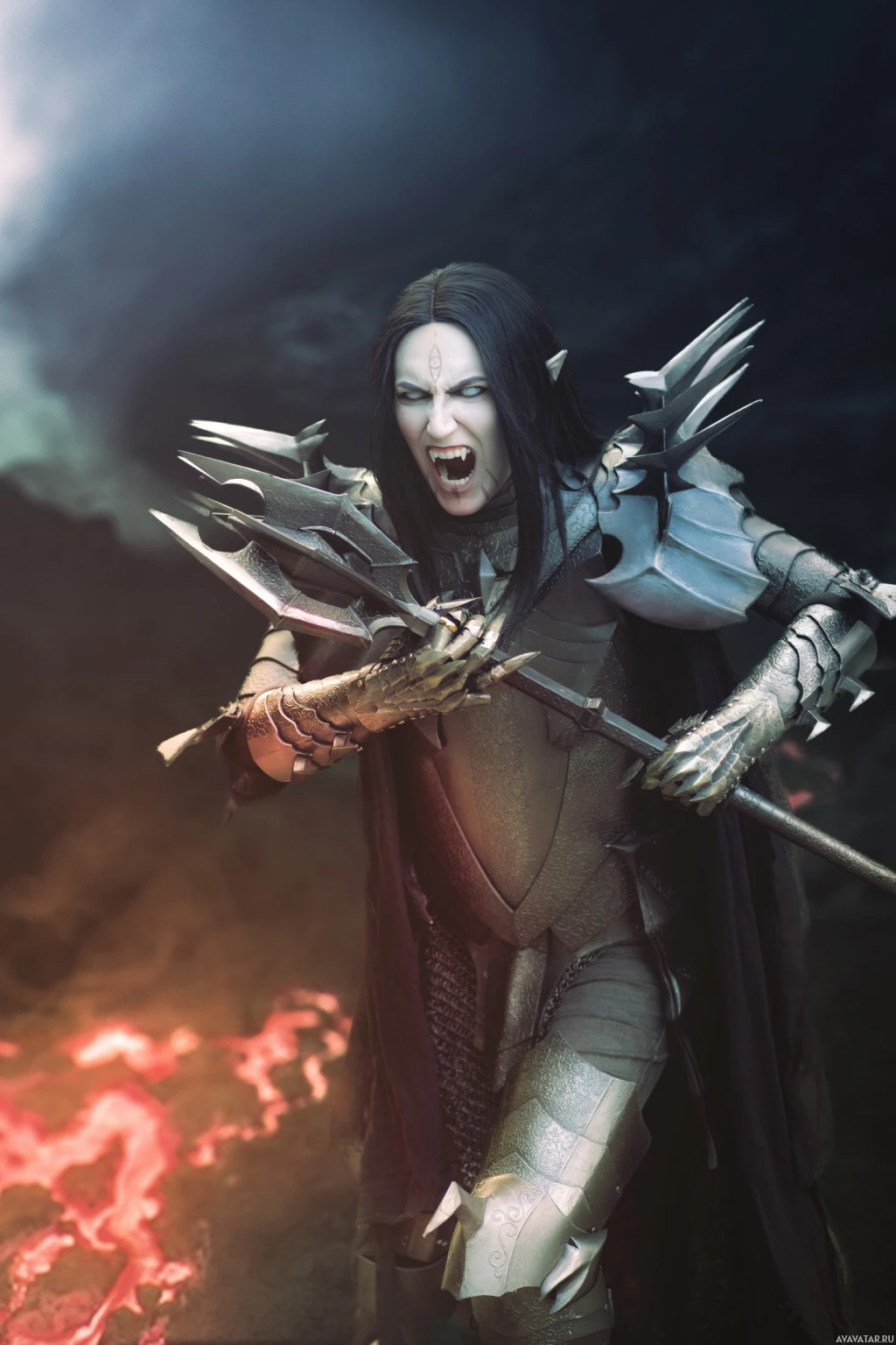 long hair, pointed ears, and is wearing armor that includes spikes and sharp edges, reminiscent of Sauron's armor. The background features dark elements like smoke and what looks like fire, which contributes to the dramatic and intense atmosphere. The character's expression suggests anger or intensity.