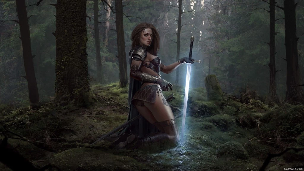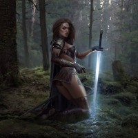 a forest floor, surrounded by lush greenery and moss. The character is wearing armor that seems to be inspired by medieval or ancient designs, with elements like plates and straps indicating protection for battle or combat. She holds a sword in one hand, suggesting she might be a warrior or a guardian. Her pose and the environment give off
