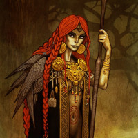 a character from a story or mythology, possibly inspired by Norse or Celtic imagery given the style of her garments and the accessories. The artwork depicts her in