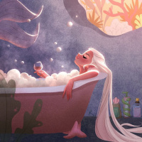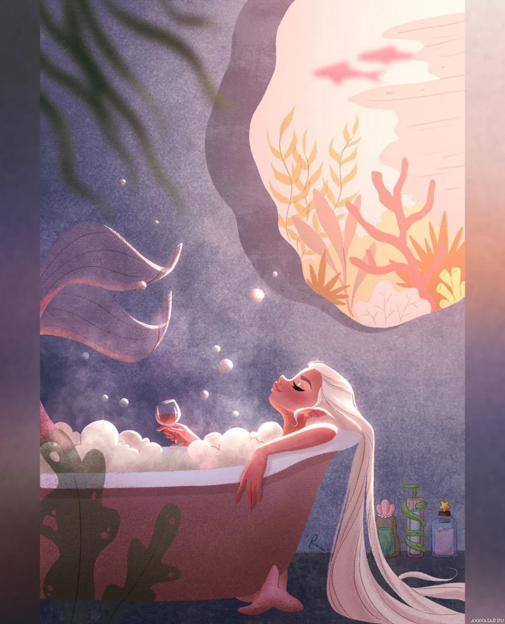 a fantasy scene featuring a mermaid in a bathtub. The mermaid has