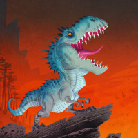 The image features an anthropomorphic T-Rex character that appears to be standing on a rock or outcrop in what looks like a fiery,