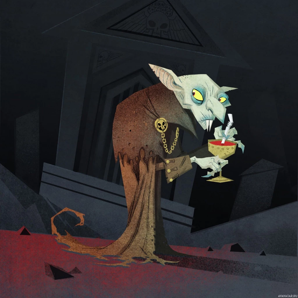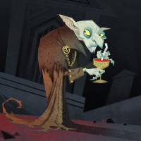 pale skin and sharp fangs, typical of vampires in folklore and fiction. The character is holding a goblet filled with an unknown liquid, possibly blood, which is often associated with vampirism in