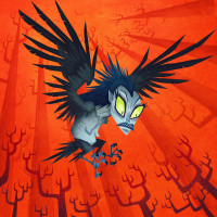 large eyes and prominent beaks. It's set against a background that appears to be a fiery or hellish environment, suggesting a setting appropriate for a fantasy or horror theme.