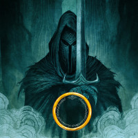 a fantasy setting, reminiscent of the Middle-earth mythology created by J.R.R. Tolkien. The character is wearing armor and holding a sword, which are typical elements for characters from such tales. In the center of the image is a ring that is well-known in this genre as the One Ring, also known as "The Ring." This ring has