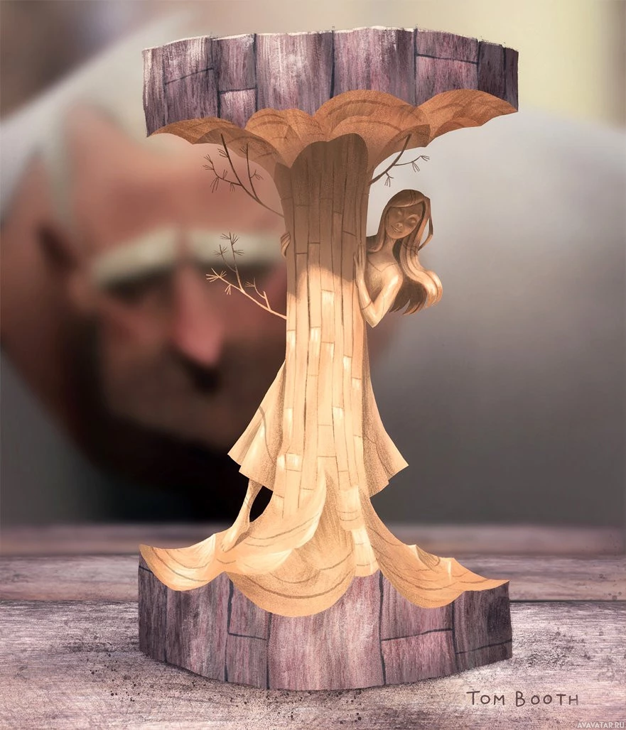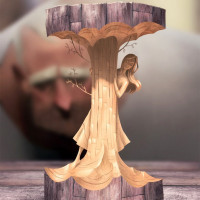 a female figure seated comfortably, seemingly nestled within its core. She is holding something small in her hands, which could possibly be an object or another character. The overall composition of the artwork is quite detailed and suggests a narrative element to it.