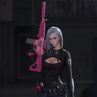 a pink weapon, which could be a handgun or a short-range shotgun, depending on the design intent. The background suggests