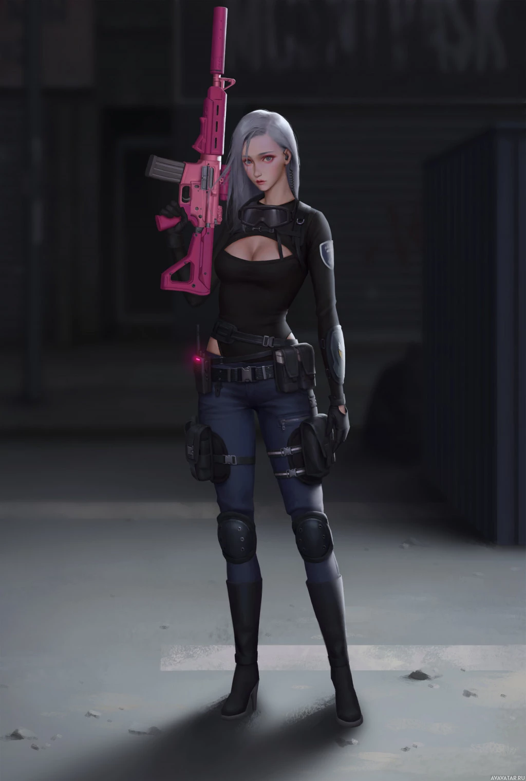 a black outfit with some sort of utility belt and a holster on her thigh. She is holding