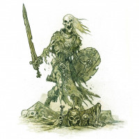 The image features a fantasy-style illustration of a knight. This character is depicted with a skeletal appearance, suggesting that they are an undead or