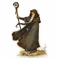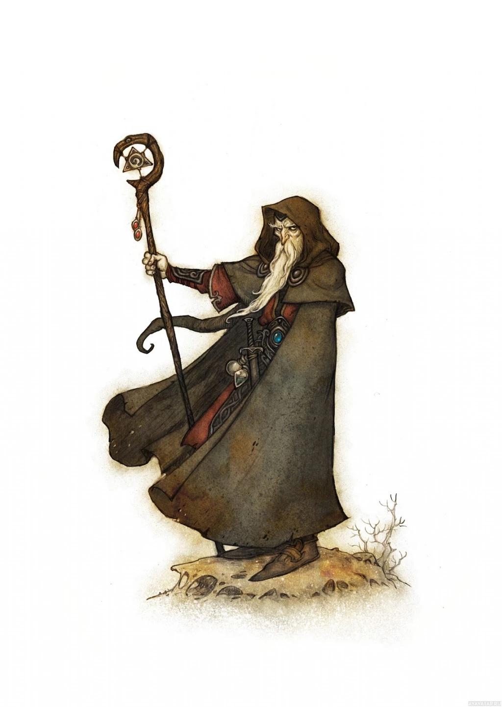 long hair, which are common attributes for wizards in fantasy settings. The character also holds what seems to be a staff or wand, further emphasizing their mystical or magical nature. The style of the illustration is reminiscent of traditional