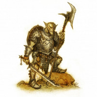 battle axe in one hand and what appears to be a shield in the other, which suggests they are ready for combat. The style of the image is reminiscent of fantasy illustrations commonly found in games and books.