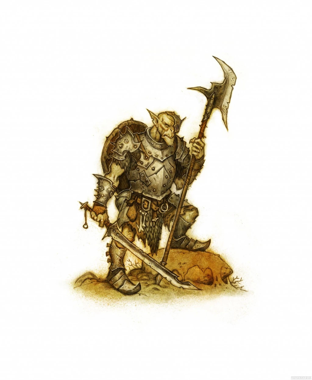 a fantasy orc character. The orc is wearing a suit of armor with a helmet and has a chainmail skirt, indicating that this might be from a role-