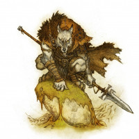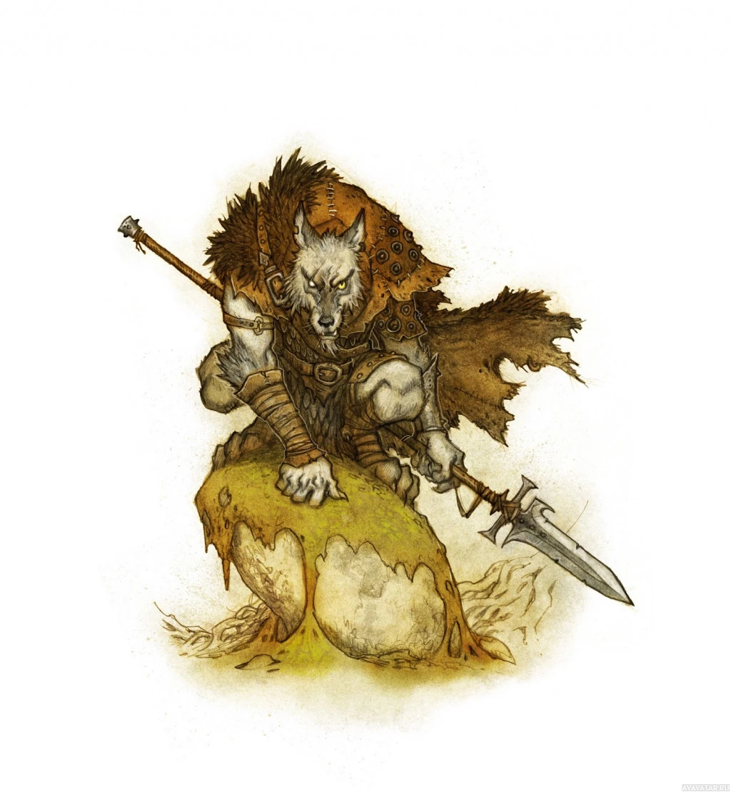 a fantasy scene featuring a character that appears to be a werewolf. The werewolf is depicted in