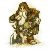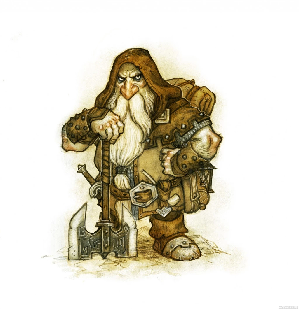 dwarf character. He has a long white beard and is wearing a brown tunic with