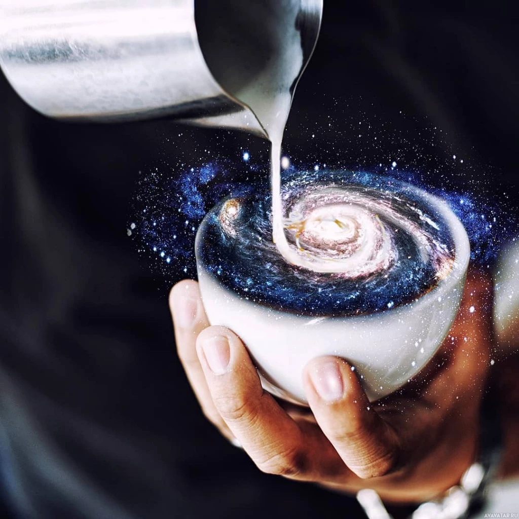 hot liquid from a cup into another mug or container. The background is altered to include an artistic representation of the cosmos, with stars and galaxies that resemble