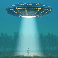 abduction scene. In the foreground, there is a lone individual standing on what appears to be