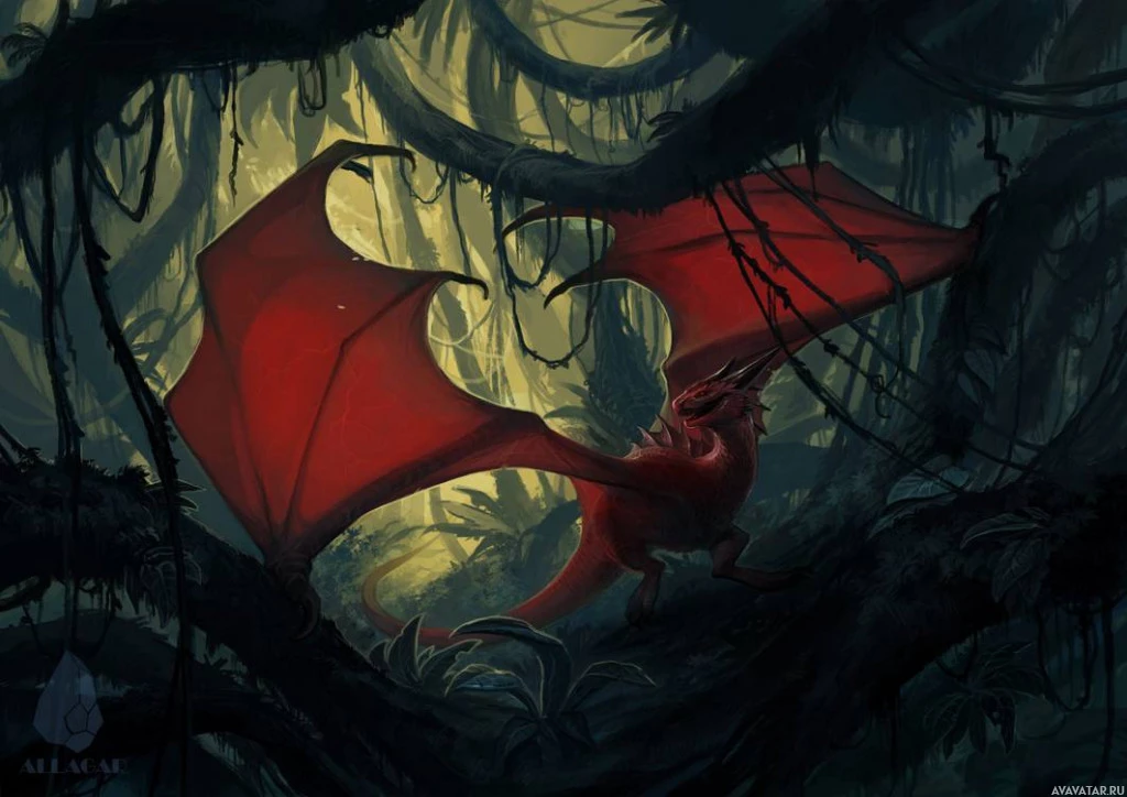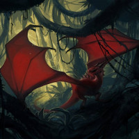 large wings and is positioned in the center, appearing to be either taking flight or standing on all fours amidst a dense forest. There's