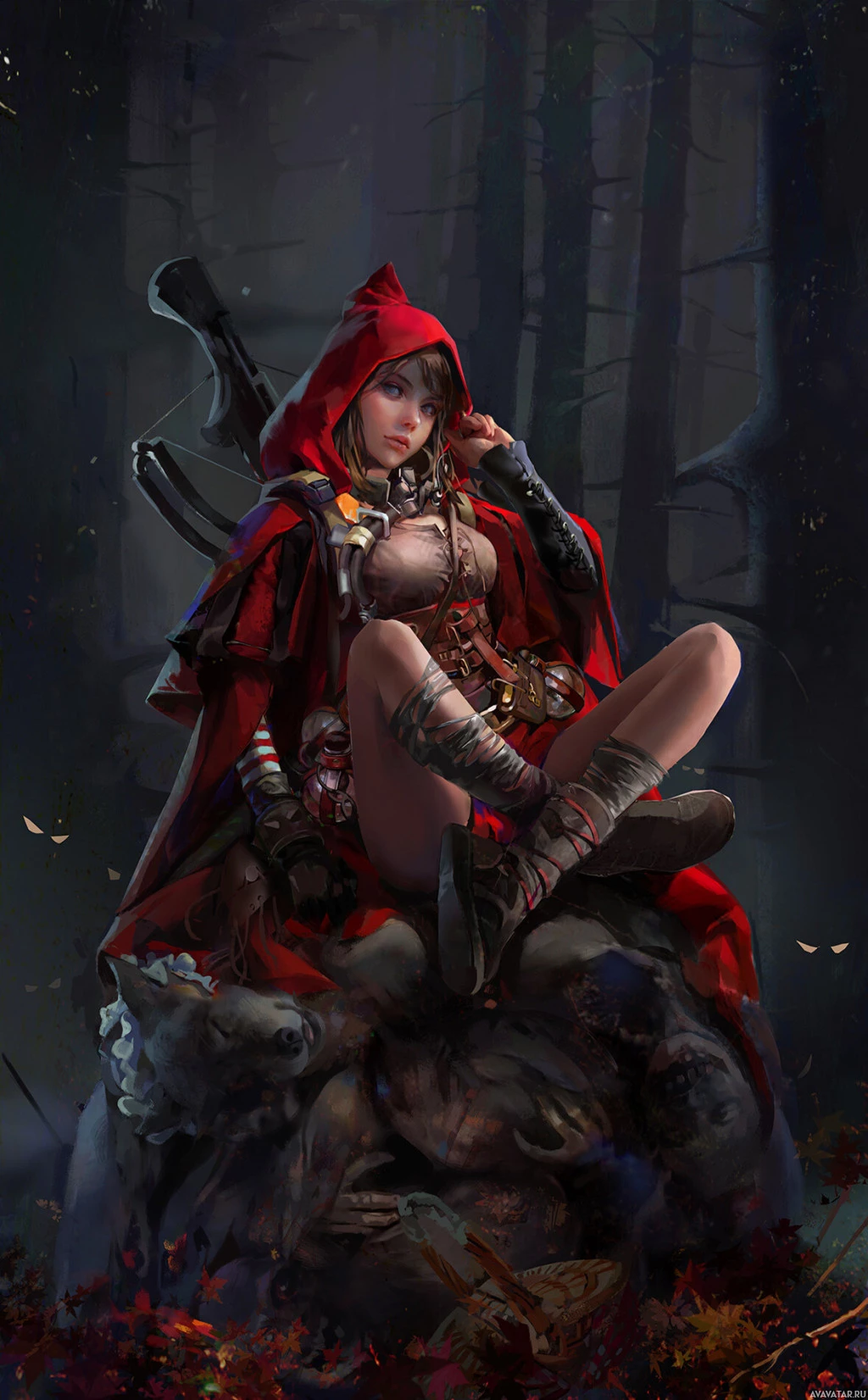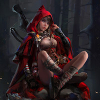 a hooded cloak with a red color scheme, similar to what might be associated with the iconic "Little Red Riding Hood" fairytale character. The character is sitting on a rock and surrounded by a forest-like environment, which gives it a mystical or adventurous feel. She appears to be holding a bow in one hand while