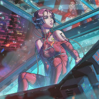 an animated character with pink hair, which appears to be a young girl. She is inside what looks like a futuristic or cyberpunk-themed environment. There are various screens and glowing elements around her, suggesting she might be in the cockpit of some sort of vehicle or control center within