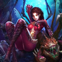 Queen of Blades form, which is a powerful and intimidating figure within the game's universe. Kerrigan is shown with prominent red skin and long claws, sitting on rocks with