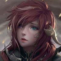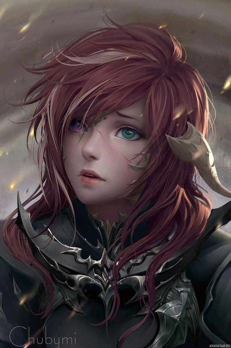 a young woman with red hair. She appears to be crying or emoting intensely. The character is also wearing armor and has some type of horned headdress, suggesting she might be from