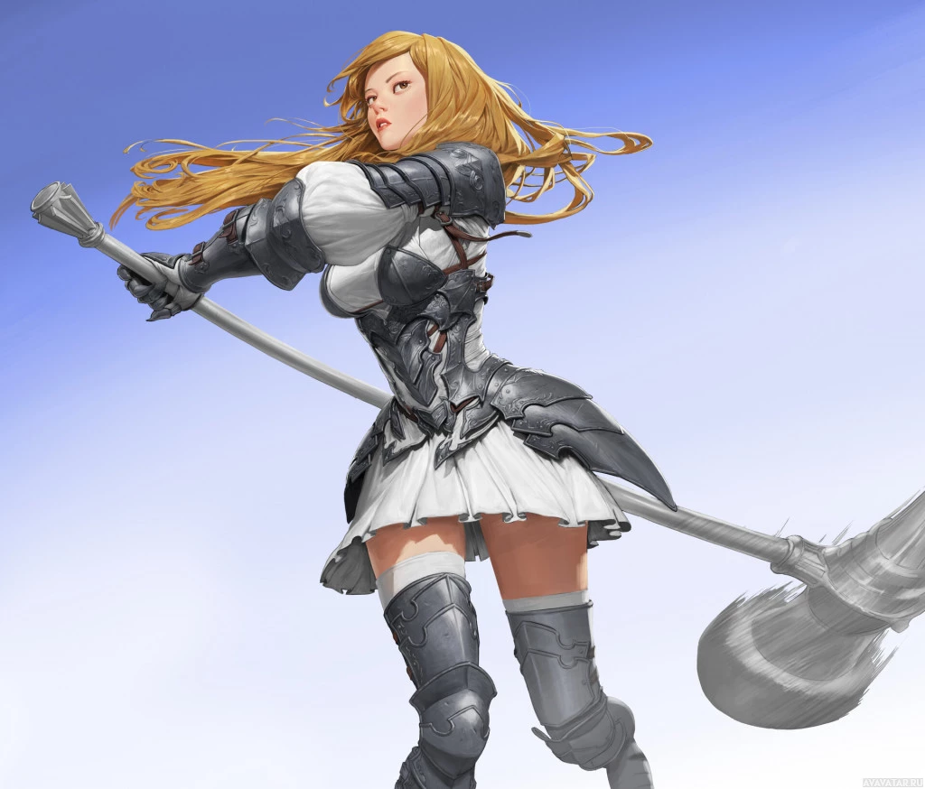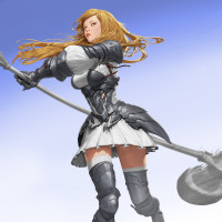 a female character, who appears to be a warrior or fantasy knight. She has blonde hair and is wearing armor with intricate designs, suggesting a scene from