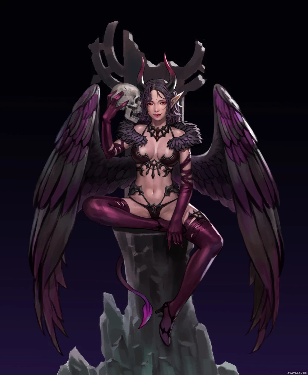 Картинка показывает персонажа, который кажется фантастическим суккубом. Она имеет крылья и украшена различными аксессуарами, которые придают ей жуткий и соблазнительный вид, соответствующий описанию мифического существа, часто связанного с искушением и похотью в фольклоре.