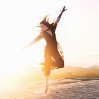 desert landscape. She appears to be mid-motion, with her arms and legs extended, possibly enjoying the freedom of movement in