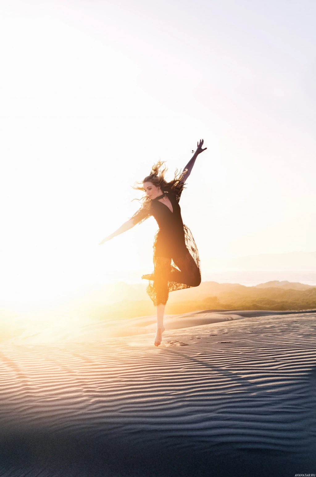 The picture features a woman dancing or posing in a sandy