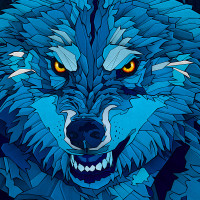 The image features a digital artwork of a wolf. The wolf appears to be stylized with blue and black colors, giving it a striking appearance against