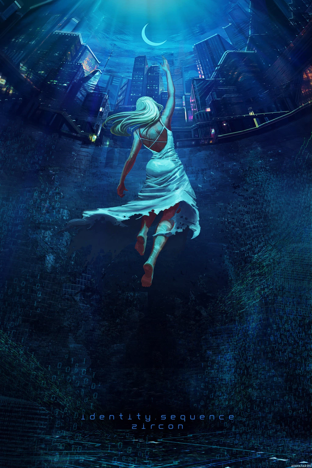 a fluid motion. Her dress is white and ripples around her like fabric in water. In the background, there are futuristic structures that seem to be made of glass or crystal, illuminated by what could be a glowing moon or