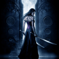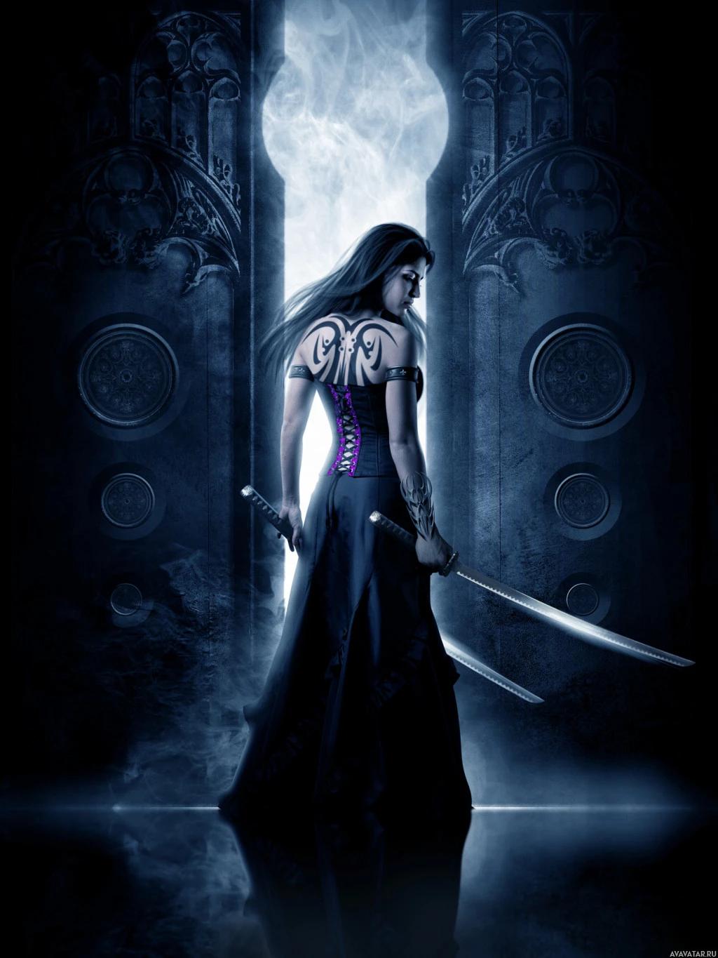 На картинке изображена девушка с длинными брюнетками, стоящая перед темным дверным проемом или проходом. У нее на спине татуировка, и она держит за спиной два меча. Общая атмосфера картины предполагает, что это может быть фантазия или приключение.
