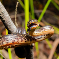 На картине изображена змея, которая является животным. Змея, по-видимому, находится в своей естественной среде обитания и, по-видимому, либо свернута на земле, либо, возможно, поднимается вверх на ветку или какую-то другую структуру.