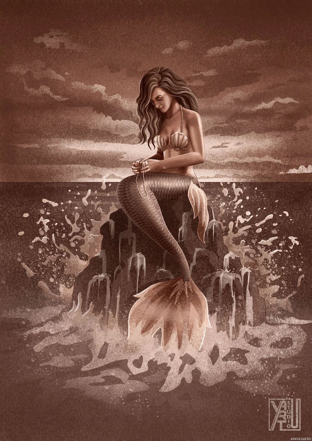 long hair and a fishtail, which is characteristic of mermaids from fantasy folklore. She appears to be sitting on rocks or in water, looking towards the horizon. The style of the artwork suggests it could be related to fantasy themes. The background has