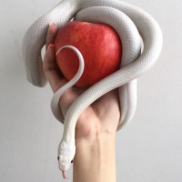 human hand is holding the snake by its body while the person's fingers are gently curled around the top of the apple. This creates