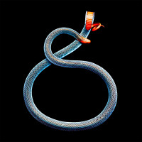 На снимке изображена змея с обвитым телом. Он, по-видимому, изменяется в цифровом виде или визуализируется, так как цвета и четкость довольно яркие и высокой четкости, которые обычно не видны на естественных изображениях змей.