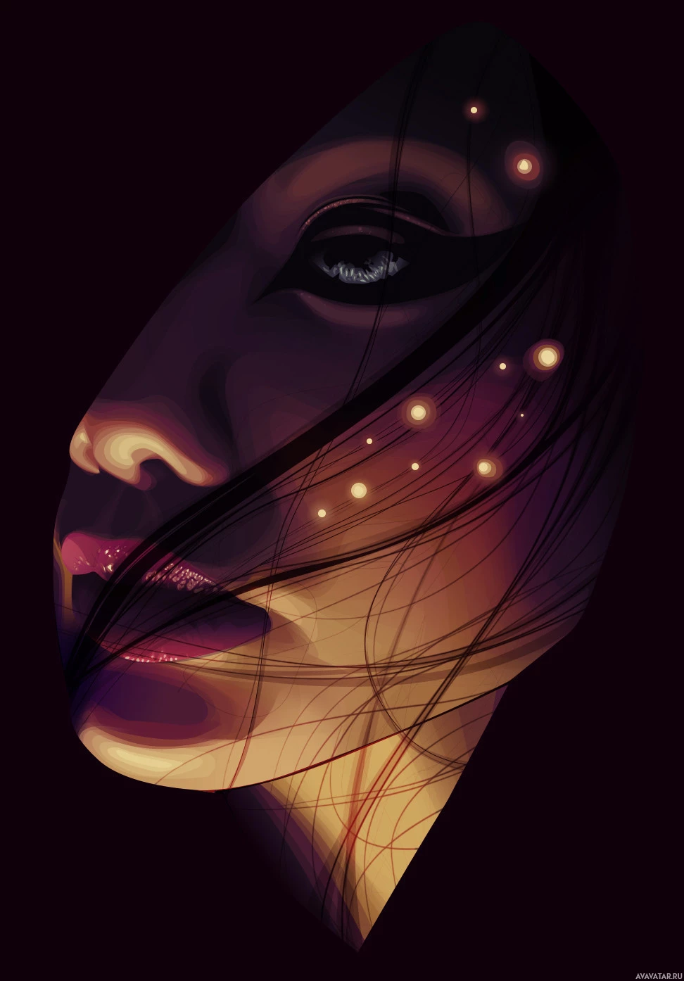 light source not visible in the frame. The background is dark and blurred, which contrasts with the illuminated features of her face, creating
