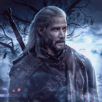 a stern expression on his face. The background suggests an atmosphere of danger or supernatural events, which aligns with the theme of the game where Geralt battles various creatures and monsters in