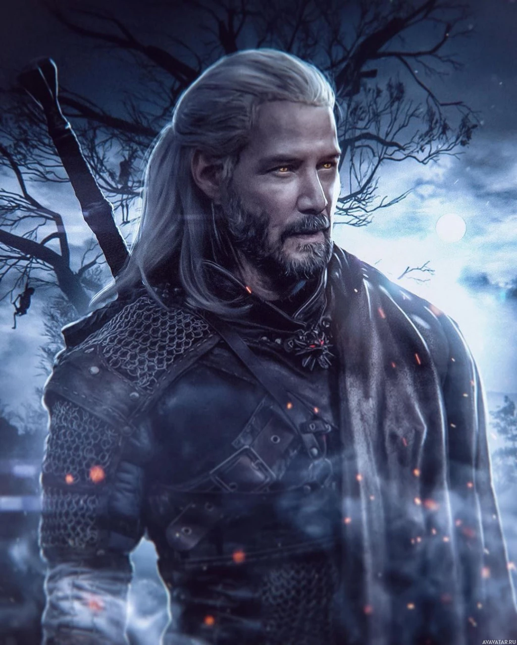 Geralt of Rivia from the game "The Witcher 3: Wild Hunt." He is depicted in a dramatic and intense pose, possibly indicating his role as